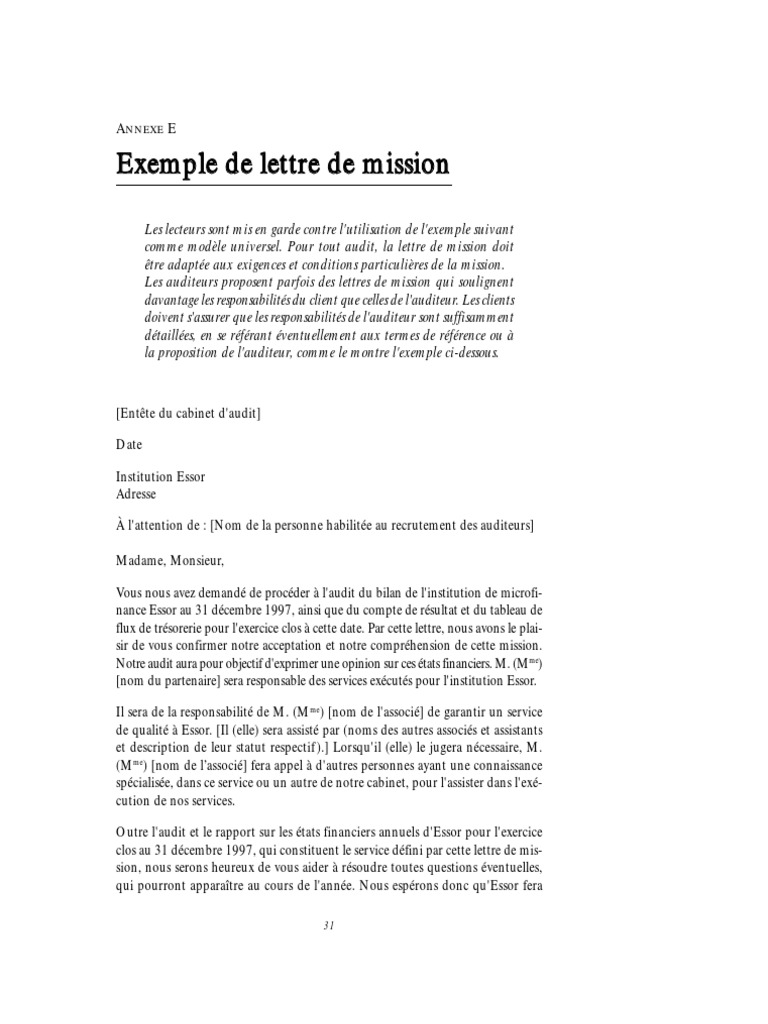 Exemple lettre de mission audit interne. La lettre de mission est un document fréquemment utilisé dans le cadre des prestations de services et plus particulièrement auprès des professionnels libéraux les indépendants ou les consultants comptable avocat auditeur. La lettre qui sera adressée au notaire instrumentant dans le cadre de la mission sera utilisée dans le respect de l article 215 alinéa 2 du code des sociétés et ne pourra être utilisée à d autres fins. Par exemple lorsqu une société est tenue de recourir aux services d un commissaire aux comptes elle lui délivre une lettre de mission rappelant la mission légale de.