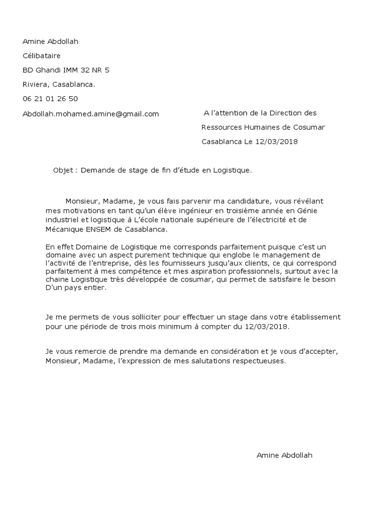 Lettre De Motivation Stage Ingénieur Mécanique